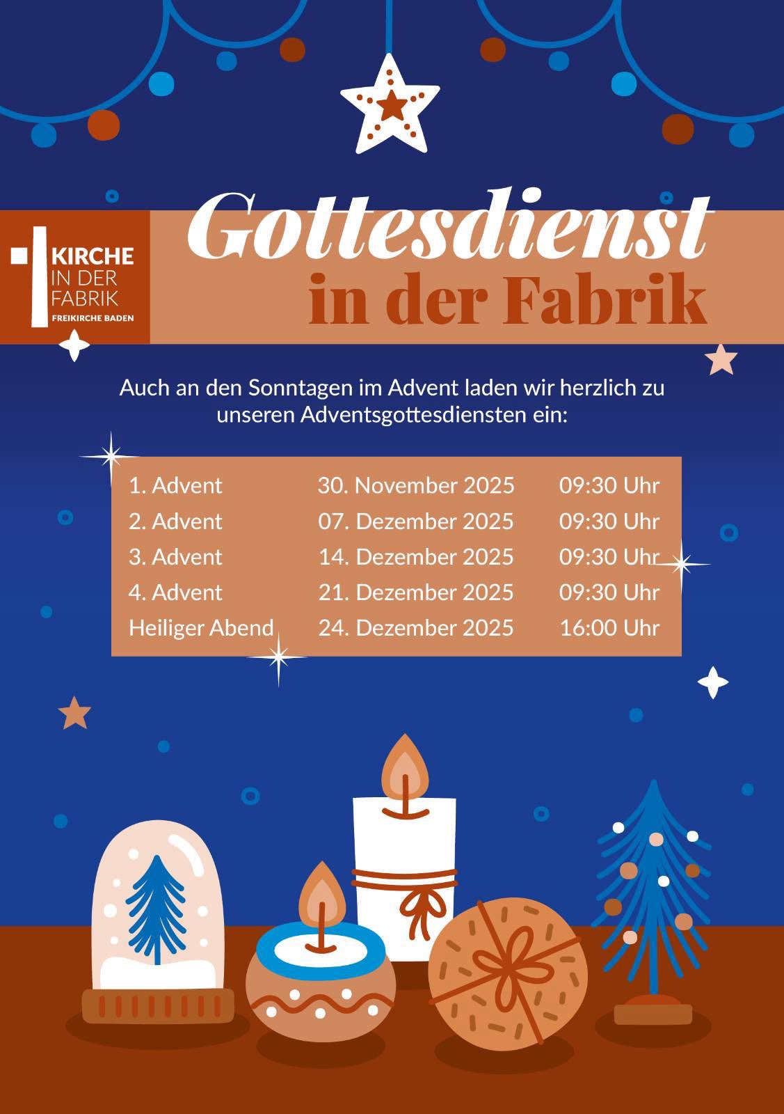 Die Adventszeit ist eine besondere Zeit der Vorbereitung und des Innehaltens. Darum laden wir Sie herzlich ein zu unseren Gottesdiensten an den Adventssonntagen in der Kirche in der Fabrik. Gemeinsam wollen wir uns auf das Kommen Christi vorbereiten und die frohe Botschaft hören.