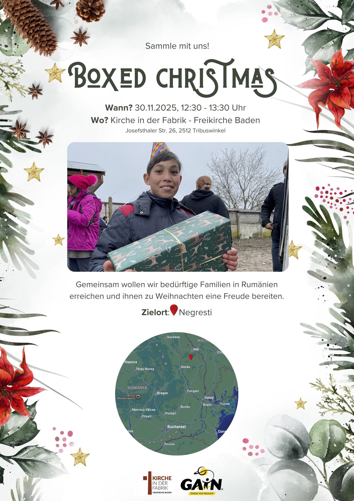 Die Weihnachtszeit - eine Zeit, wo man sich besonders darauf besinnt, wie reich man doch beschenkt wurde. Aus Erfahrung können viele von uns bestimmt zustimmen: diese Freude wächst sogar noch, wenn man andere Leute beschenkt, vor allem, wenn es ihnen nicht so gut geht. Umso mehr wollen wir durch unsere Weihnachtsboxen vielen Familien in Negresti aus der Region Vaslui, Rumänien ein schönes Weihnachtsfest bescheren. Die Leben ist dort besonders hart, weshalb wir mit den diesjährigen Spenden gerne ein wenig Erleichterung schaffen würden.